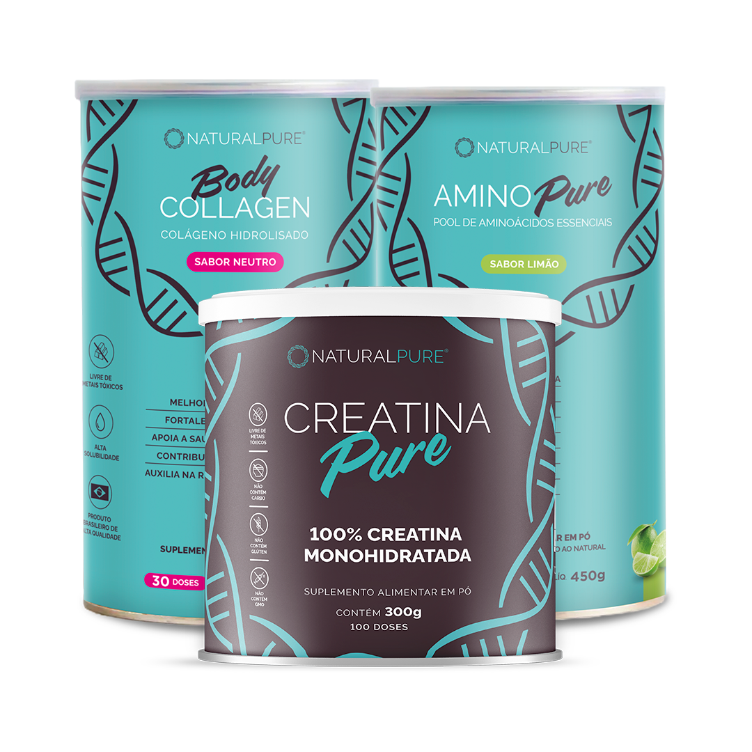 Siga a recomendação individual de cada produto. A creatina pode ser usada antes ou após o treino. O Amino Pure pode ser consumido em jejum ou no pré-treino. O Body Collagen deve ser ingerido diariamente, preferencialmente junto das refeições.