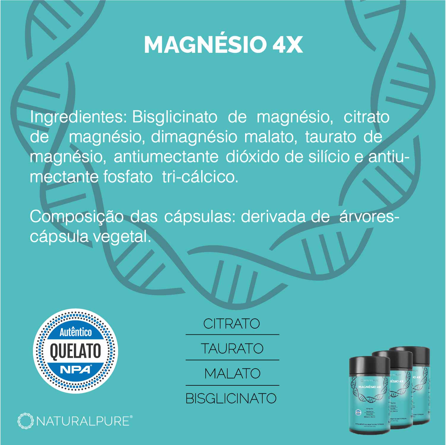 Corpo fortalecido, mente serena e energia para ir além. O Magnésio 4X da Natural Pure reúne, em uma única cápsula, as quatro formas mais biodisponíveis e eficazes de magnésio: citrato, taurato, bisglicinato e malato. Uma combinação inteligente e sinérgica, desenvolvida para quem busca equilíbrio físico, clareza mental, disposição e qualidade de vida.